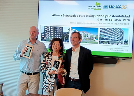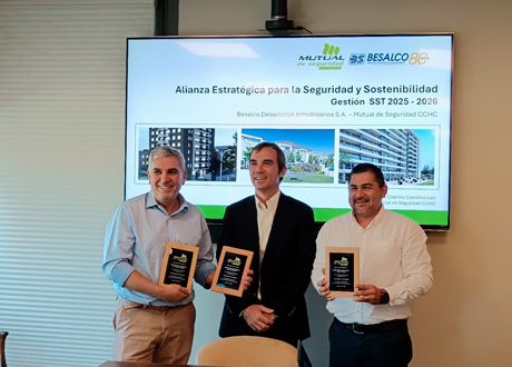 En el marco de la alianza estratégica entre Besalco Desarrollos Inmobiliarios S.A. y la Gerencia de Construcción de Mutual de Seguridad CCHC, se desarrolló una reunión de trabajo orientada a fortalecer la colaboración en Seguridad y Salud en el Trabajo (SST) y revisar los resultados de gestión proyectados para el período 2025–2026. Esta instancia permitió reafirmar el compromiso conjunto con la construcción de entornos laborales más seguros y sostenibles para las entidades empleadoras adheridas y sus personas trabajadoras protegidas.