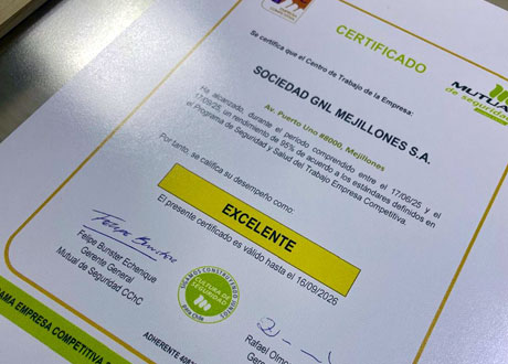 En representación de GNLM, participaron Guillermo Collao, Jefe H&S, y Alicia Rivera, Especialista H&S, quienes recibieron el reconocimiento en una ceremonia realizada en la Agencia Mutual Antofagasta.