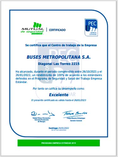 Bajo ese contexto, y tras haber dado cumplimiento a todos los hitos, que son requisitos dentro del programa de sistema de gestión que promueve Mutual de Seguridad, fue entregado el certificado de PEC ESTÁNDAR a la empresa METBUS, por su excelente desempeño en la implementación de este.